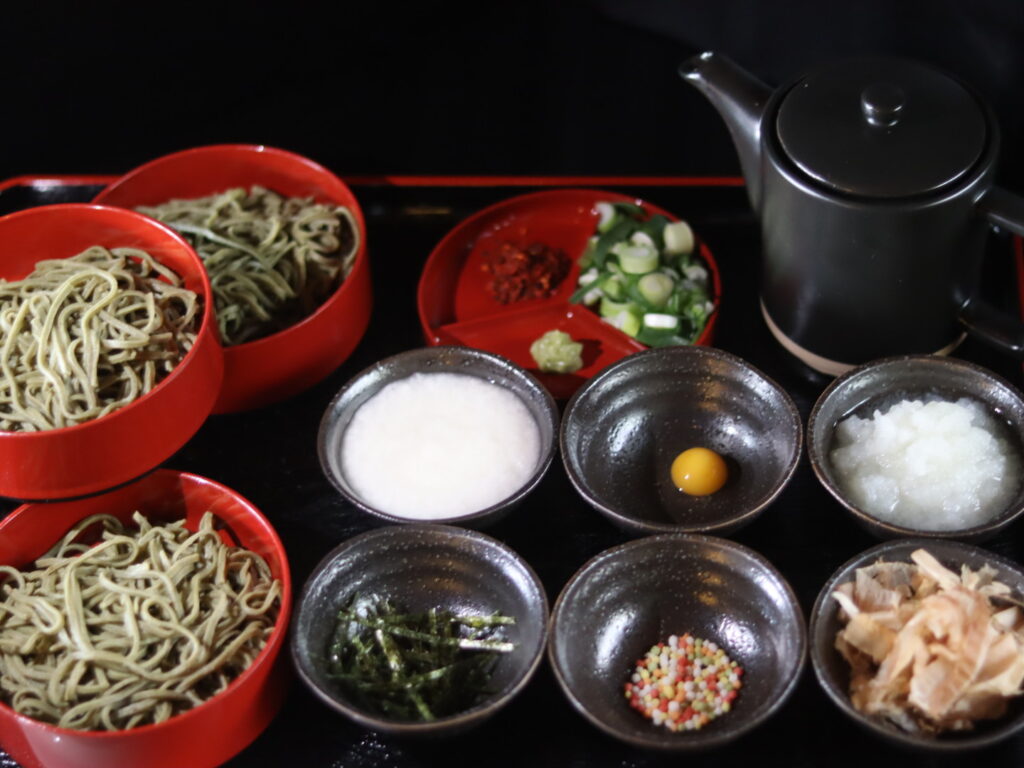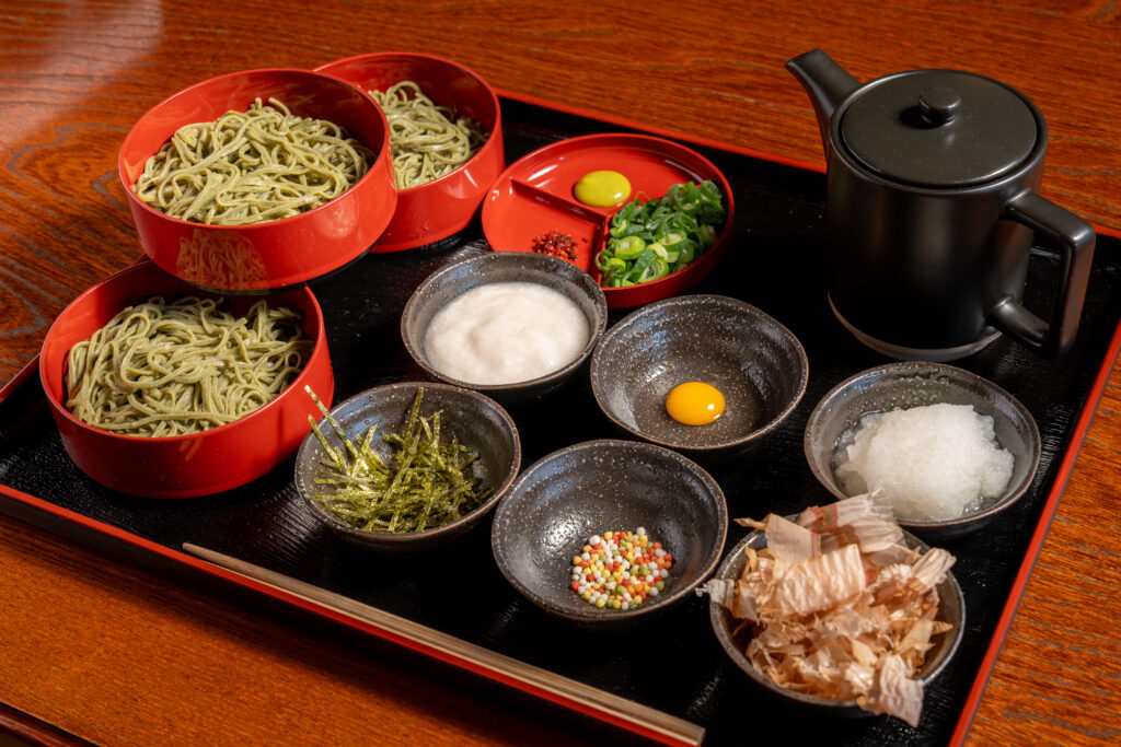 三段のお重に盛り付けた茶蕎麦を、多彩な薬味と共にゆっくりお楽しみいただけます。